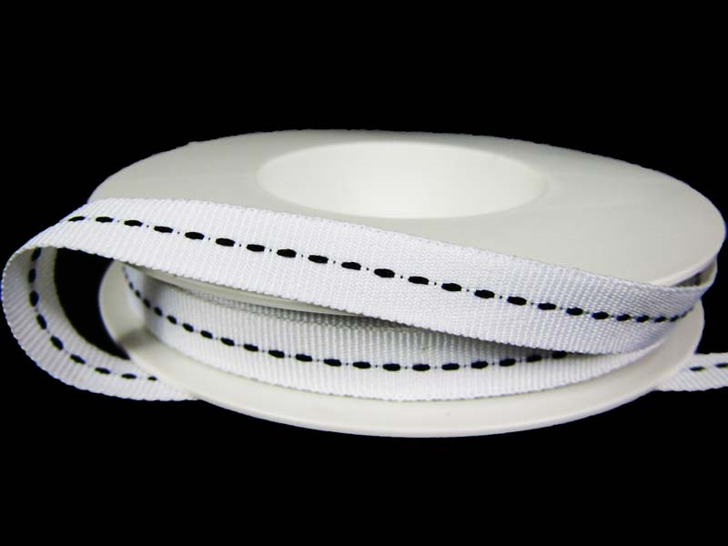 Taśma ryps stebnowana o szerokości 10mm w kolorze białym z czarną stebnówką.