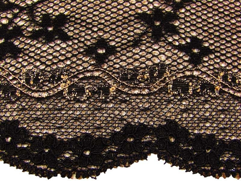 Koronka elastyczna o szerokości 17cm w kolorze czarnym z elementami w kolorze beżu. Symetrycznie obustronnie wykończona.
