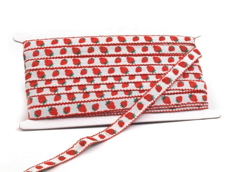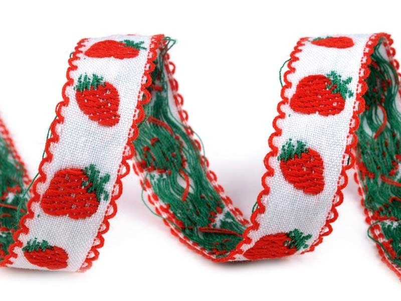 Taśma haftowana o szerokości 1,6cm z owocowym wzorem w kolorze. Taśma żakardowa pierwotnie przeznaczona do ozdabiania strojów ludowych, dziś używana jest również do ozdabiania odzieży, tekstyliów do mieszkań, zabawek i przedmiotów upominkowych. Oferuje nieograniczone możliwości zastosowania. Taśma żakardowa tkana maszynowo i wykonana z przędzy poliestrowej.