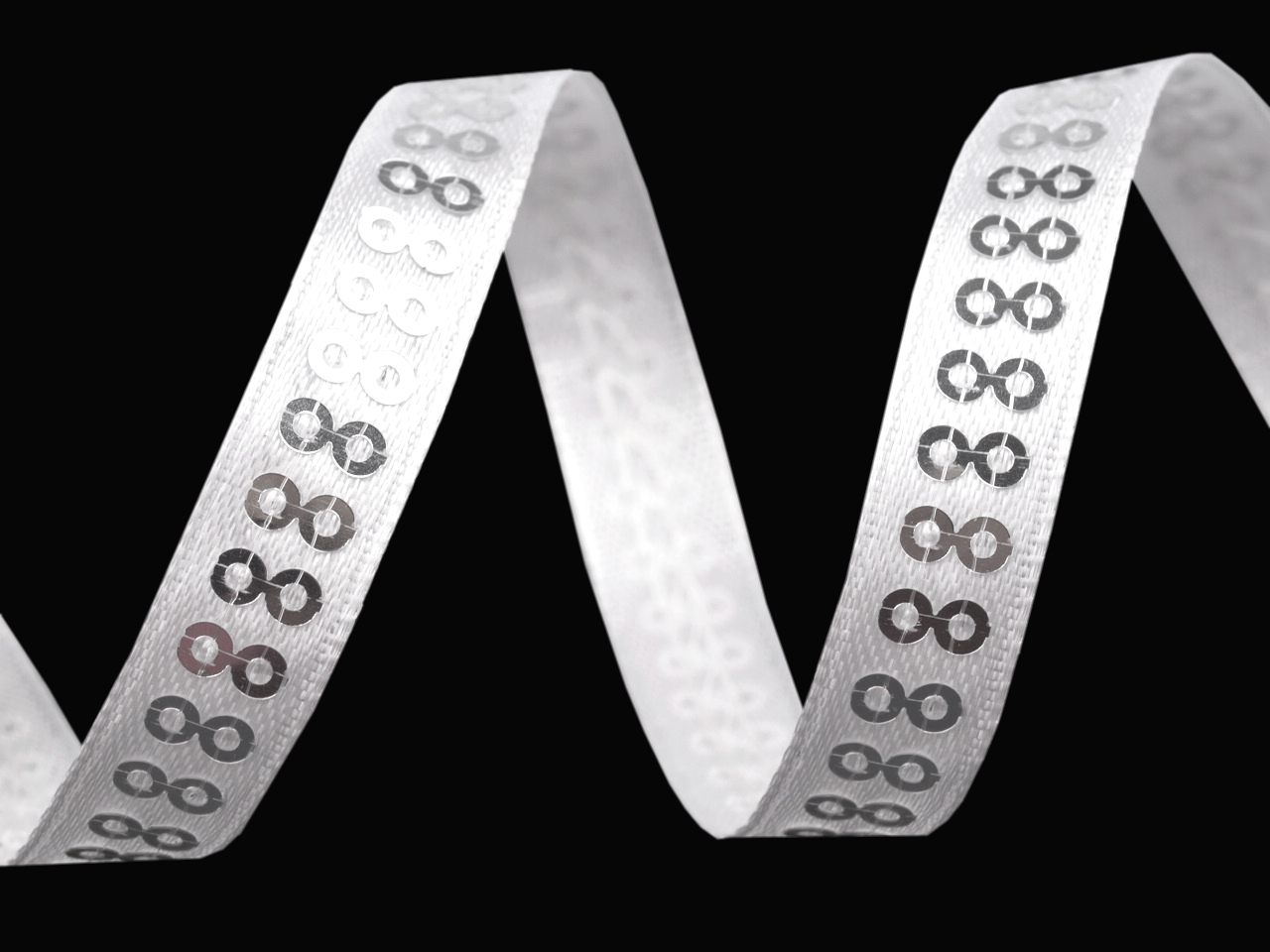 - Taśma atłasowa o szerokości 1cm wysadzana malutkimi, okrągłymi, srebrnymi cekinami w kolorze.
