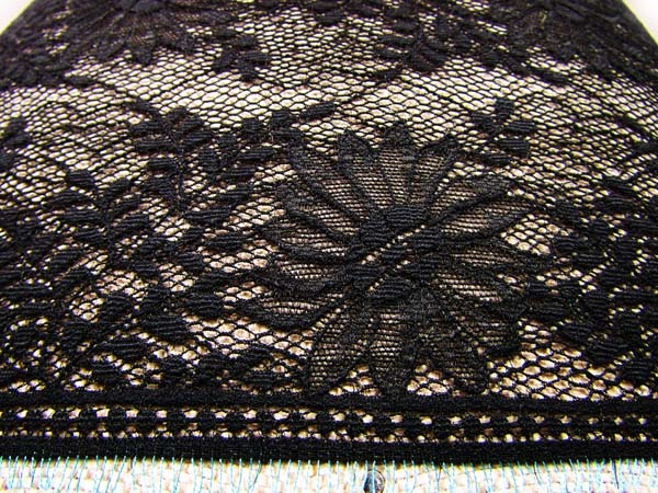Koronka elastyczna o szerokości 17cm w kolorze czarnym z turkusowym niteczkami wykańczającymi obustronnie brzegi koronki.