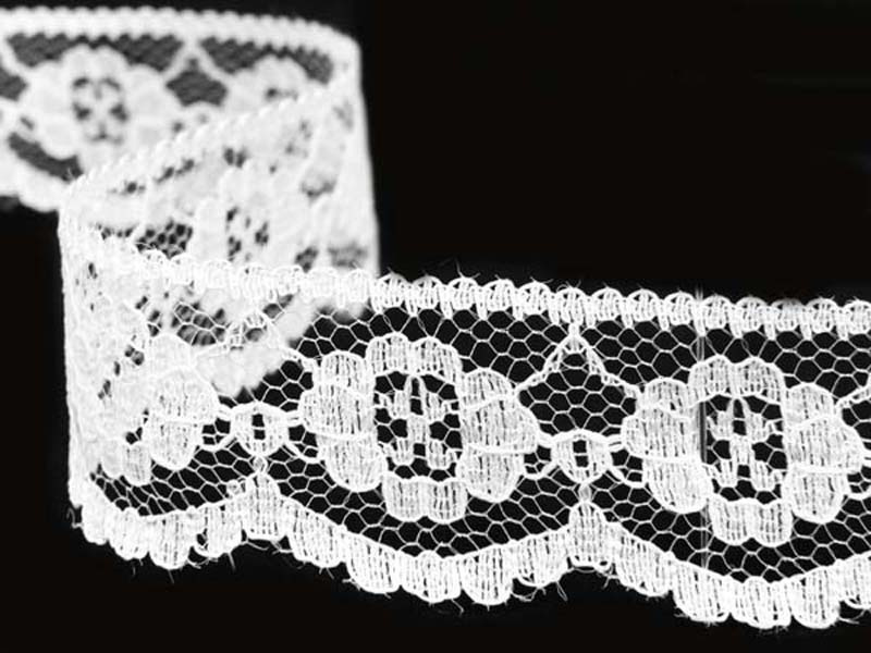 Koronka stabilna o szerokości 2,7cm w kolorze. Koronka jest szorstka w dotyku i należy do średnio sztywnych.