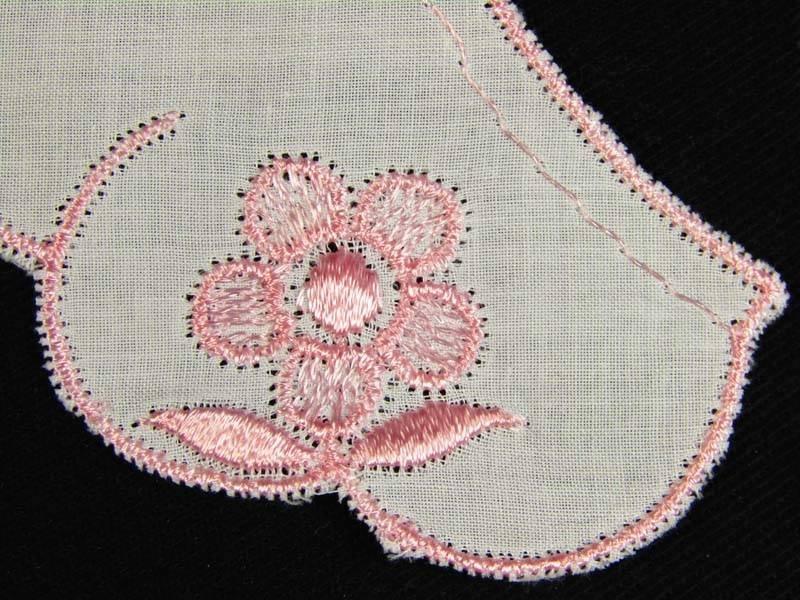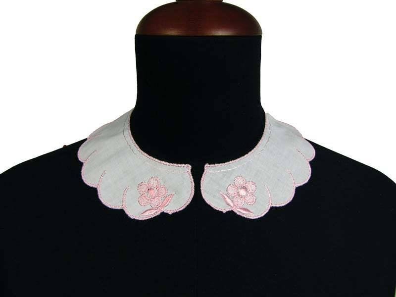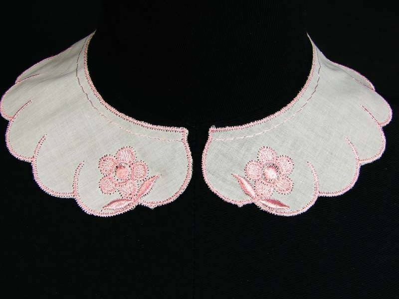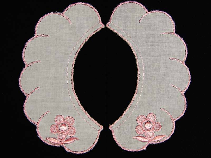 Dziecięcy kołnierzyk haftowany błyszczącą nitką wiskozową na białej etaminie.
