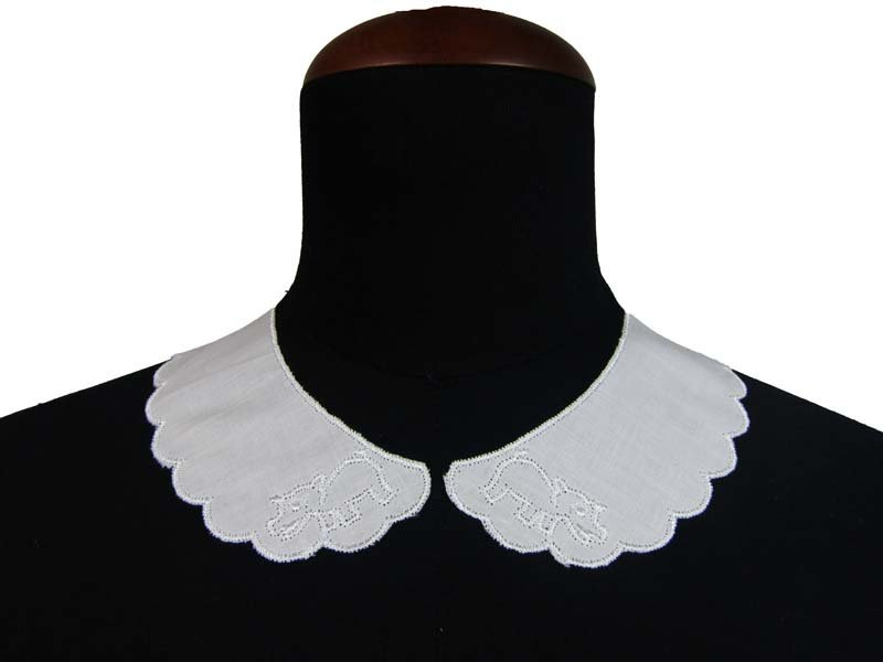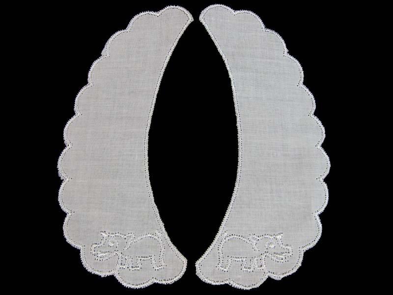 Dziecięcy kołnierzyk haftowany błyszczącą nitką wiskozową na białej etaminie.