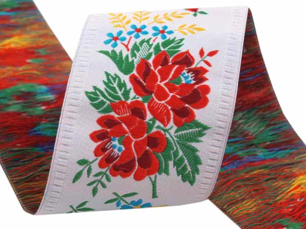 Taśma żakardowa o szerokości 55mm pierwotnie przeznaczona do ozdabiania strojów ludowych, dziś używana jest również do ozdabiania odzieży, tekstyliów do mieszkań, zabawek i przedmiotów upominkowych. Oferuje nieograniczone możliwości zastosowania. Taśma żakardowa tkana maszynowo i wykonana z przędzy poliestrowej.