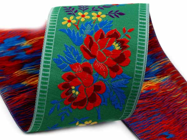 Taśma żakardowa o szerokości 55mm pierwotnie przeznaczona do ozdabiania strojów ludowych, dziś używana jest również do ozdabiania odzieży, tekstyliów do mieszkań, zabawek i przedmiotów upominkowych. Oferuje nieograniczone możliwości zastosowania. Taśma żakardowa tkana maszynowo i wykonana z przędzy poliestrowej.