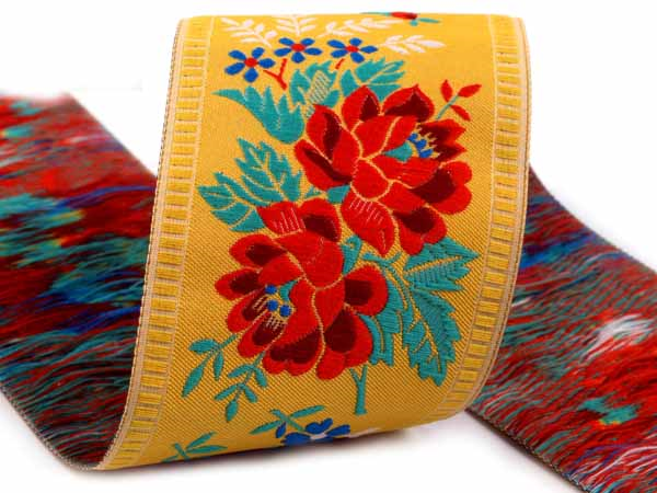 Taśma żakardowa o szerokości 55mm pierwotnie przeznaczona do ozdabiania strojów ludowych, dziś używana jest również do ozdabiania odzieży, tekstyliów do mieszkań, zabawek i przedmiotów upominkowych. Oferuje nieograniczone możliwości zastosowania. Taśma żakardowa tkana maszynowo i wykonana z przędzy poliestrowej.