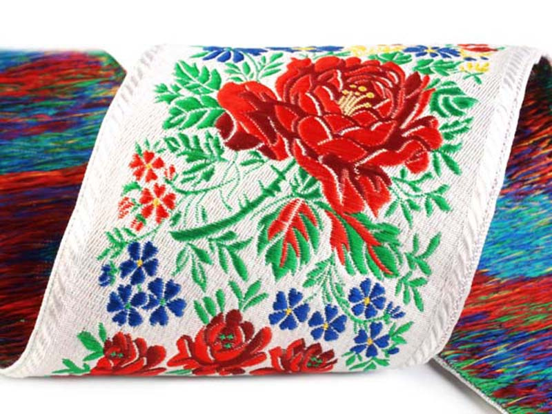 Taśma żakardowa o szerokości 10cm pierwotnie przeznaczona do ozdabiania strojów ludowych, dziś używana jest również do ozdabiania odzieży, tekstyliów do mieszkań, zabawek i przedmiotów upominkowych. Oferuje nieograniczone możliwości zastosowania. Taśma żakardowa tkana maszynowo i wykonana z przędzy poliestrowej.