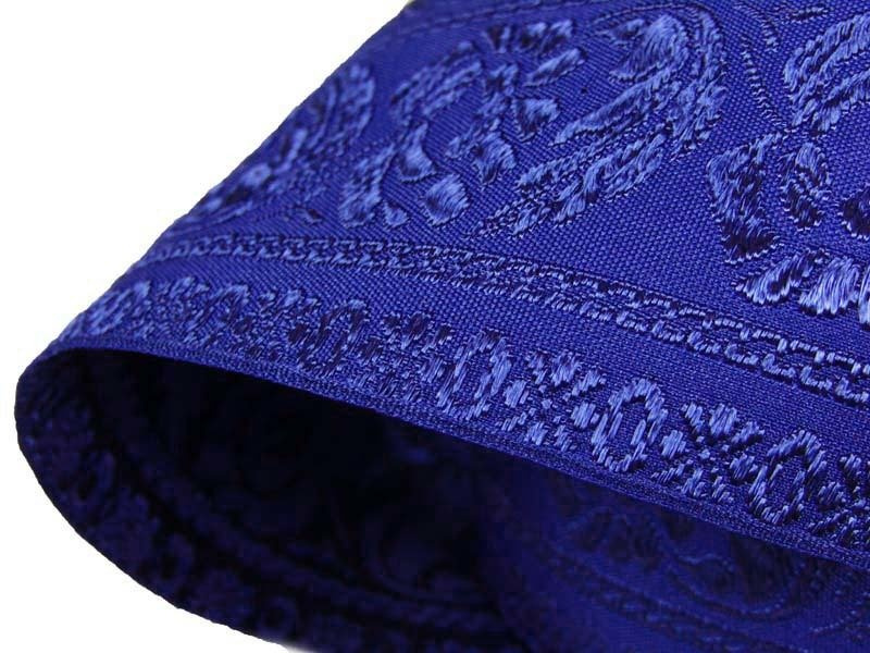 - Matowa taśma żakardowa o szerokości 5,5cm z błyszczącymi haftowanymi elementami.