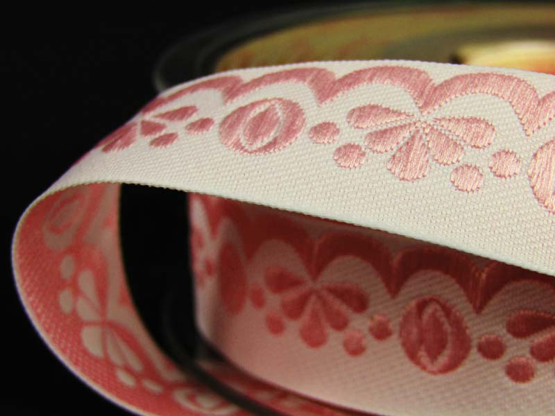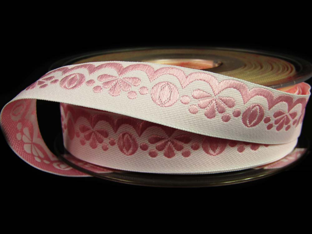 Jednostronnie wykończona ozdobna taśma z wiskozowym haftem o szerokości 1,9cm w kolorze.