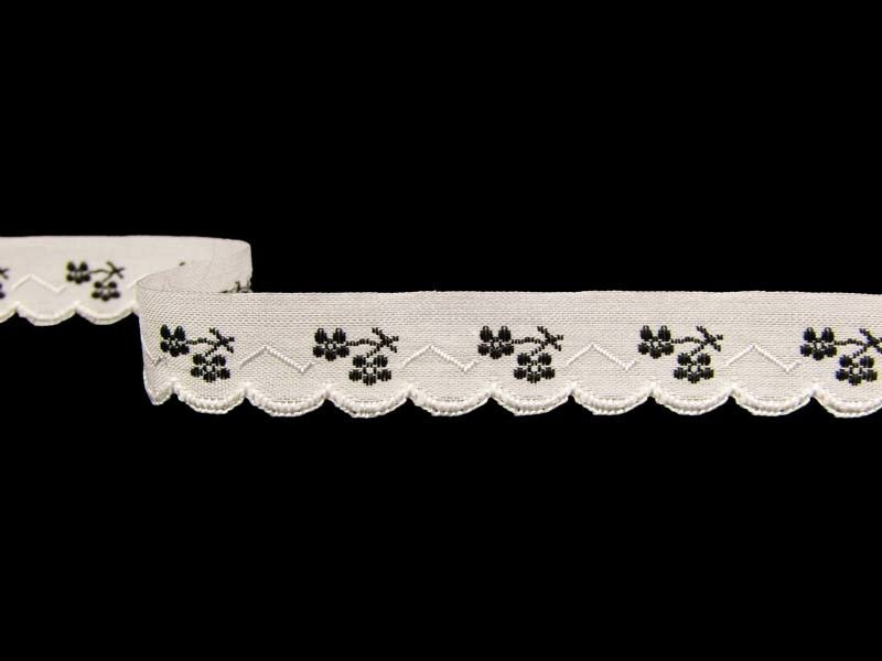 Jednostronnie wykończona ozdobna taśma z wiskozowym haftem o szerokości 1,5cm w kolorze.