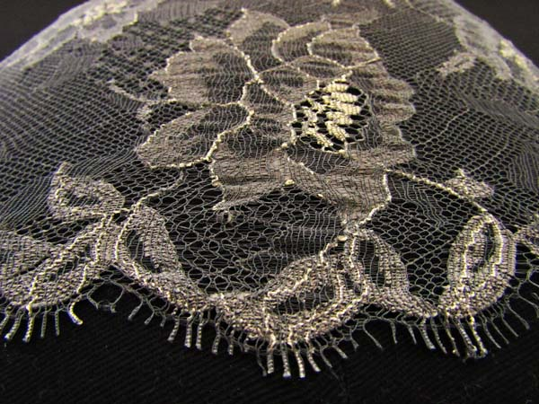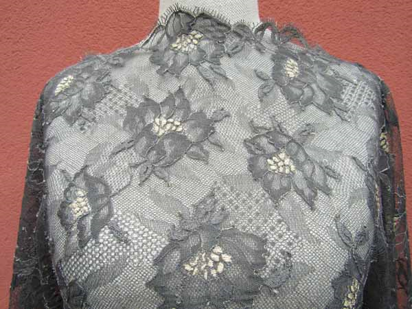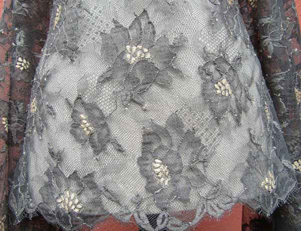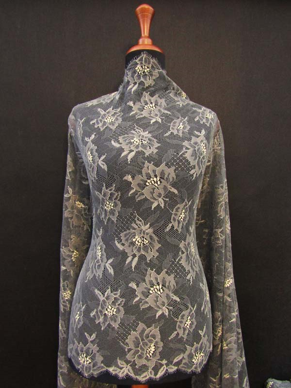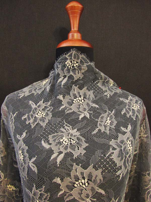 Elastyczna tkanina w formie koronki o wzorze kwiatowym w kolorze popielatym z punktami w kolorze ecru. Koronka jest obustronnie wykończona i pracuje wzdłuż i wszerz.