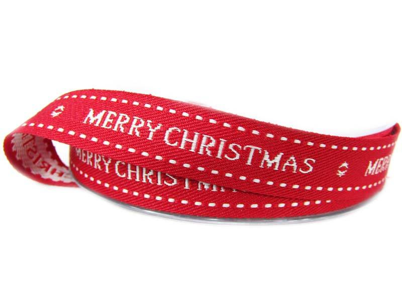 - Wstążka o szerokości 15mm ze świątecznym napisem tkanym na czerwonym tle.