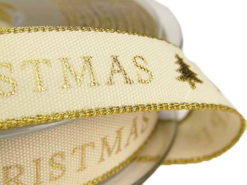- Matowa wstążka z tafty o szerokości 15mm ze świątecznym, brokatowym napisem w kolorze.