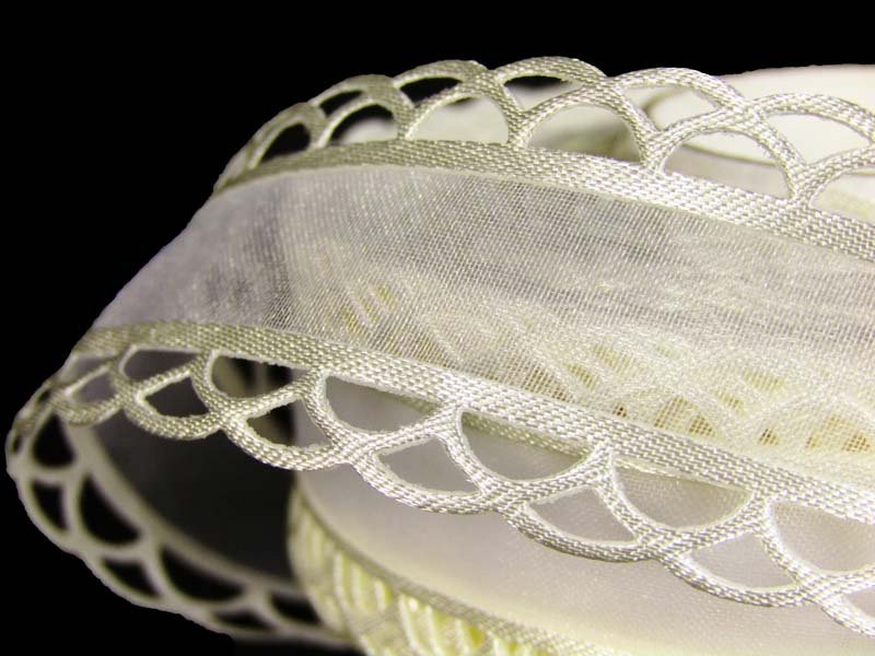 Gładka wstążka organdynowa ozdobiona na brzegach atłasem w formie koronki. Idealna ale tylko w celach dekoracyjnych. Wstążki nie można prać.