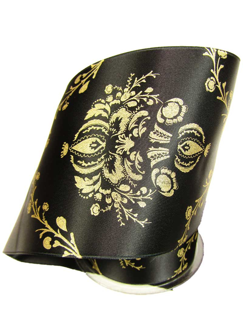 Piękna satynowa, półmatowa wstążka w kolorze o szerokości 10cm z nadrukowanym ornamentem w kolorze złotym.