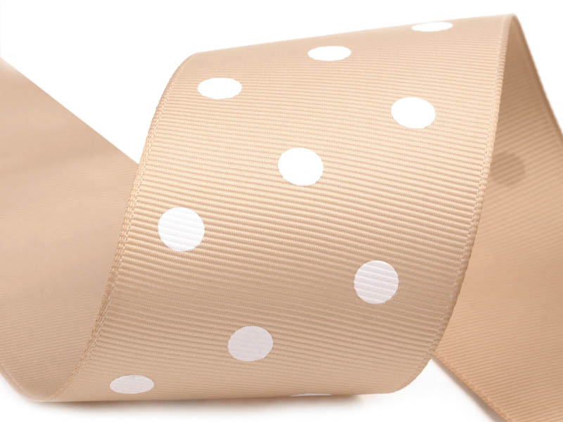 - Wstążka rypsowa o szerokość 50mm z białym nadrukiem o wzorze kropek.