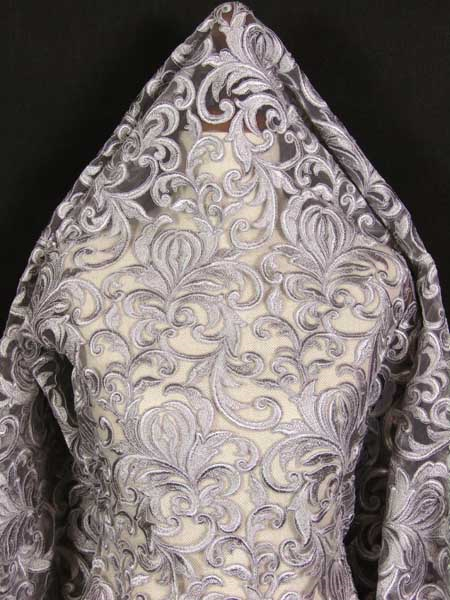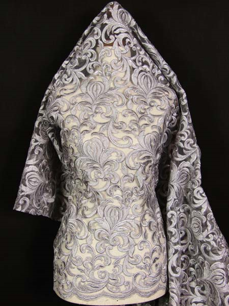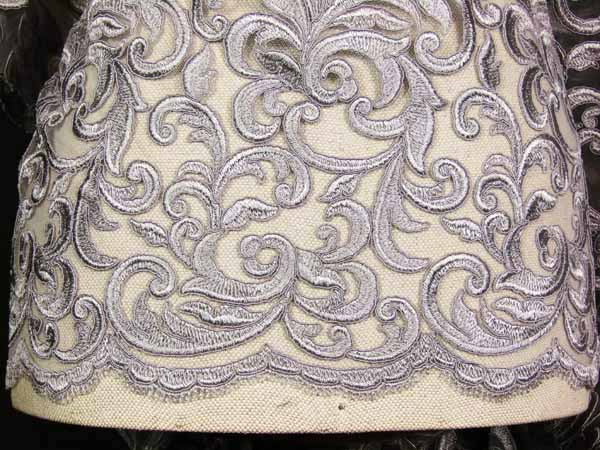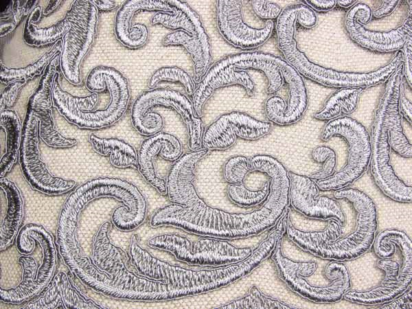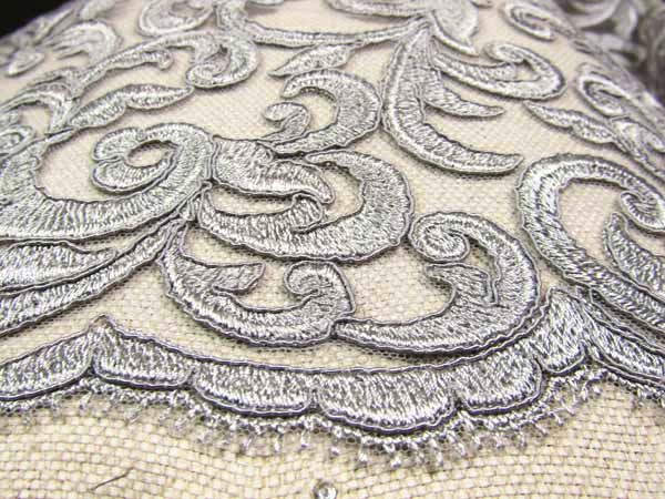 - Gęsty & mięsisty haft o wzorze roślinnym nałożony na miękkim tiulu w tym samym kolorze.