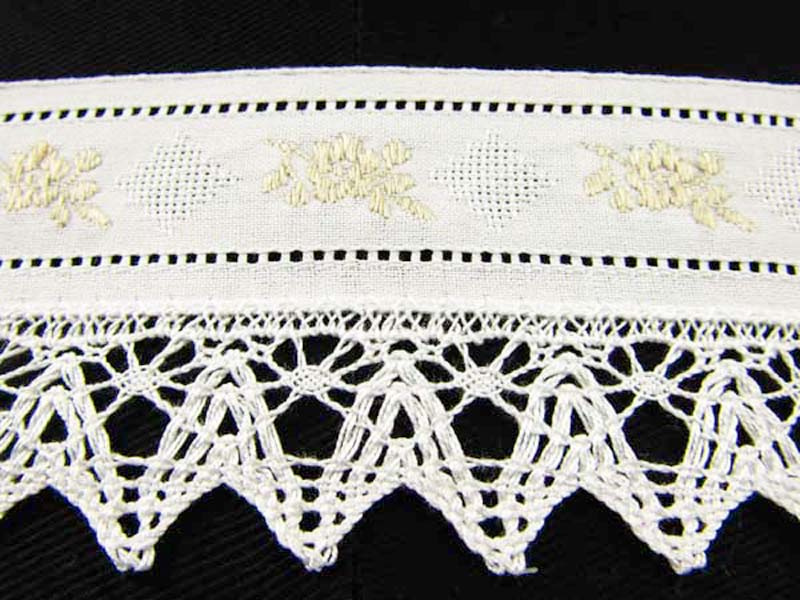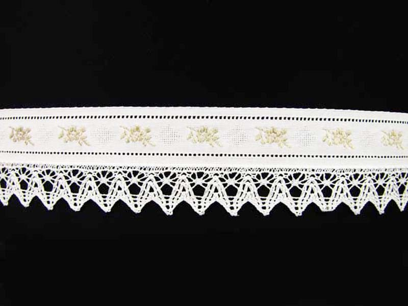 Koronka bawełniana połączona z haftem angielskim o szerokości 5cm w kolorze. Haft w kolorze lnu i biała taśma.