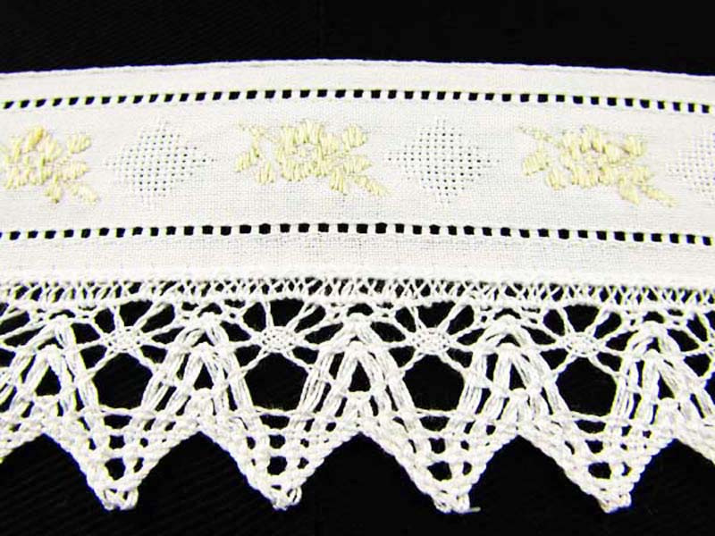 - Koronka bawełniana połączona z haftem angielskim o szerokości 5cm w kolorze.