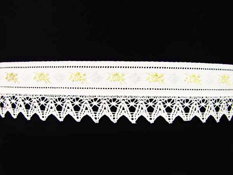 Koronka bawełniana połączona z haftem angielskim o szerokości 5cm w kolorze. Haft w kolorze ekri i biała taśma.
