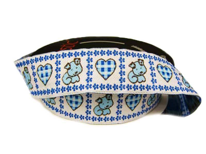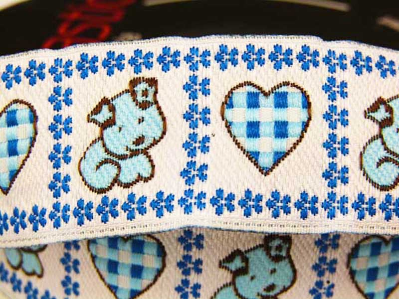 - Taśma żakardowa z pięknie haftowanym motywem na niebieskim tle.