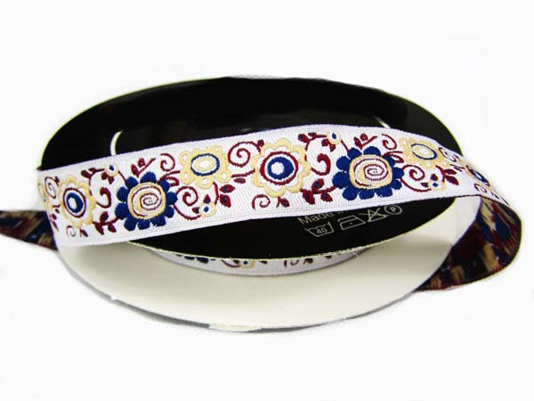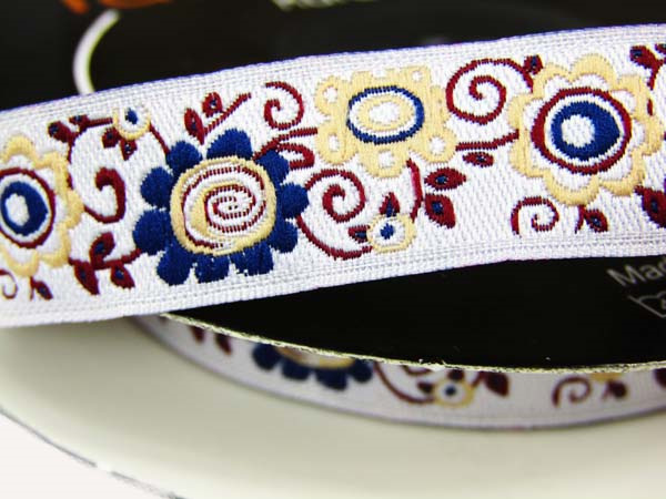 - Taśma haftowana o szerokości 1,5cm z motywem kwiatowym w kolorze.