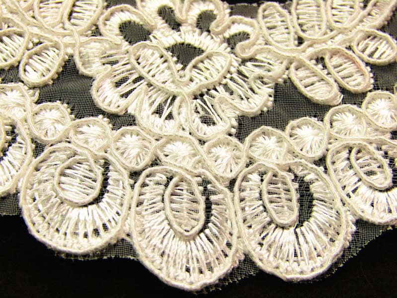 Koronka haftowana na organtynie o szerokości 8,5cm w kolorze kości słoniowej.