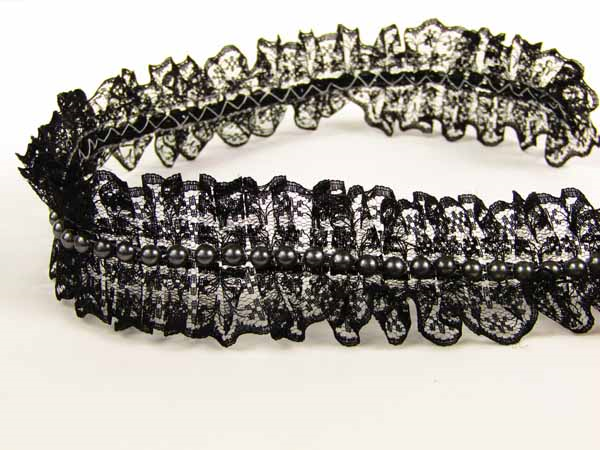 - Taśma marszczona o szerokości 4cm wykonana ze stabilnej koronki. Dodatkowo ozdobiona sznurem białych pół-pereł o średnicy 6mm.