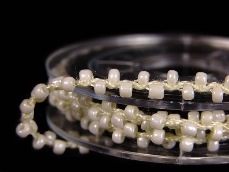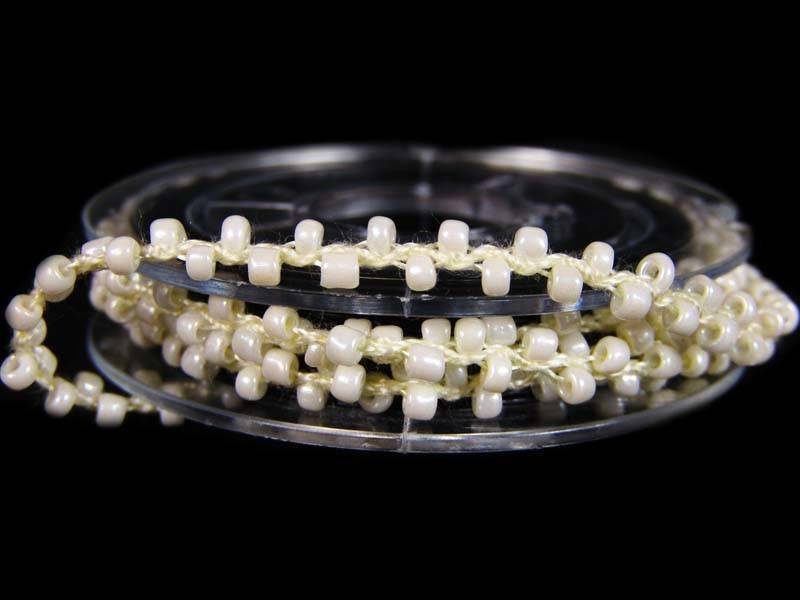 Taśma ozdobna w formie skręconych sznurków z nawleczonymi koralikami w kolorze.