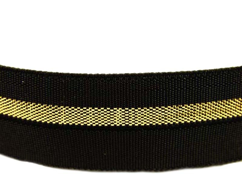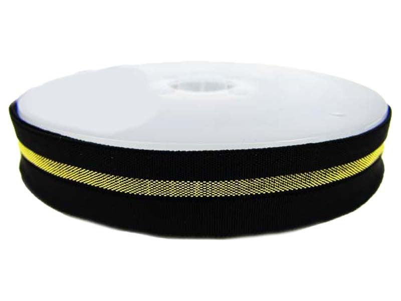 Czarna lamówka elastyczna o szerokości 2cm ze złotym lampasem pośrodku.