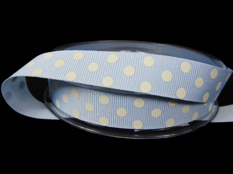 • Rypsowa wstążka o szerokości 1,5cm w kolorze z jednostronnym, kolorowym nadrukiem w formie kropek.