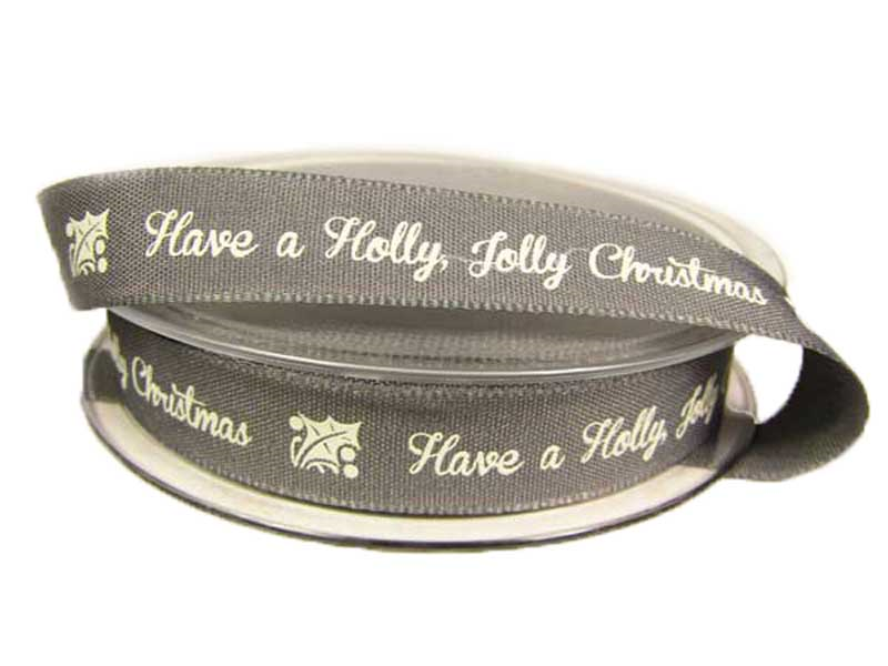 Wstążka 15mm tafta HOLLY JOLLY CHRISTMAS popiel