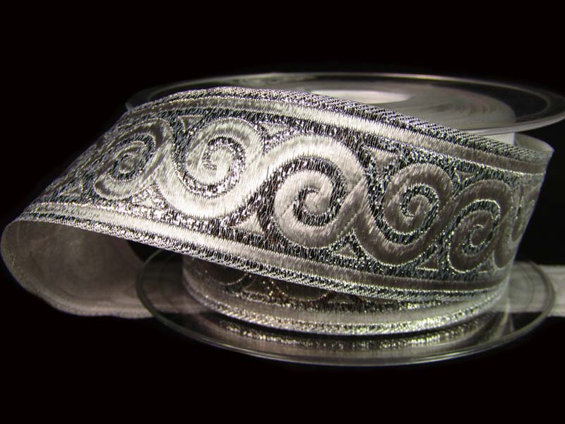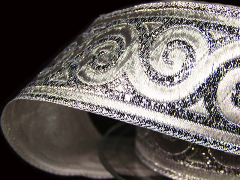 - Taśma żakardowa o szerokości 3,5cm z motywem w kolorze srebrnym.