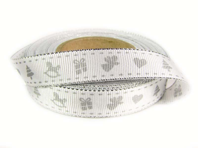 Wstążka rypsowa o szerokości 1,5cm ze srebrnym świątecznym nadrukiem i błyszczącym brzegiem.