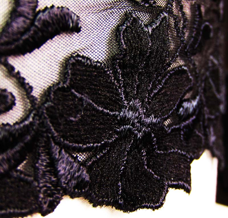 Czarna koronka tiulowa, miękka i delikatna w dotyku, z błyszczącym haftem w tym samym kolorze. Taśma jest wykończona obustronnie, nadaje się do naszycia.