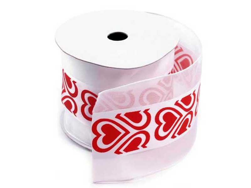Wstążka organtynowa o szerokości 65mm z nadrukowanymi czerwonymi sercami pośrodku.