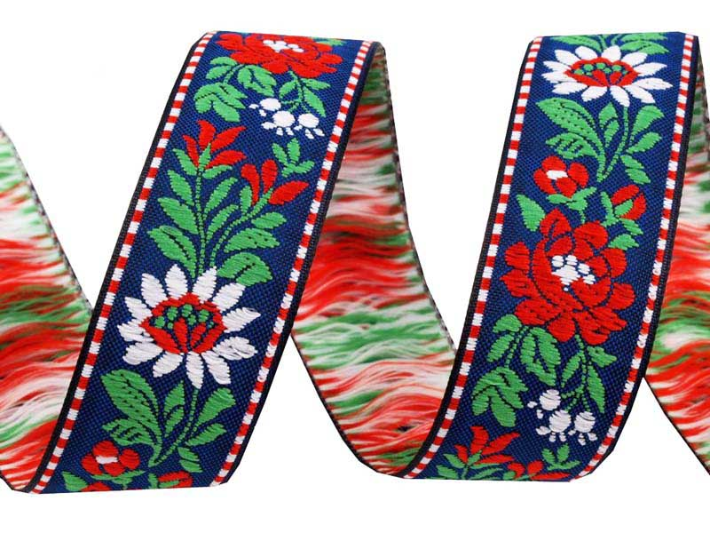 Taśma żakardowa pierwotnie przeznaczona do ozdabiania strojów ludowych, dziś używana jest również do ozdabiania odzieży, tekstyliów do mieszkań, zabawek i przedmiotów upominkowych. Oferuje nieograniczone możliwości zastosowania. Taśma żakardowa tkana maszynowo i wykonana z przędzy poliestrowej.