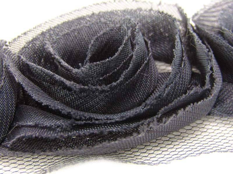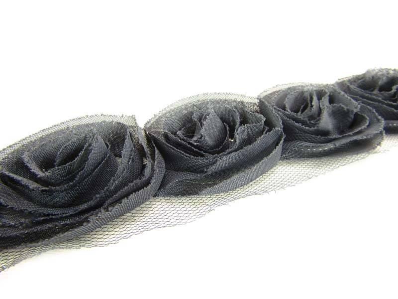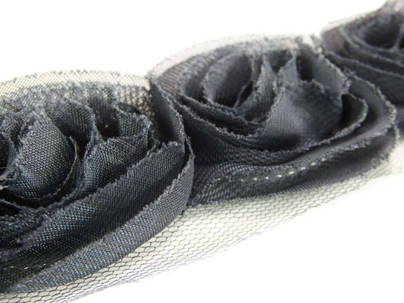 - Taśma ozdobna w formie zwijanych szyfonowych róż naszytych na pasku tiulu w tym samym kolorze.