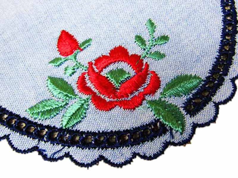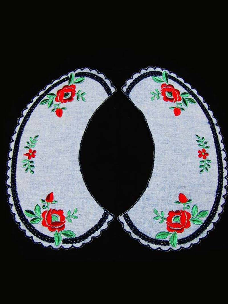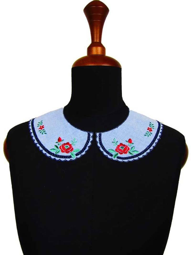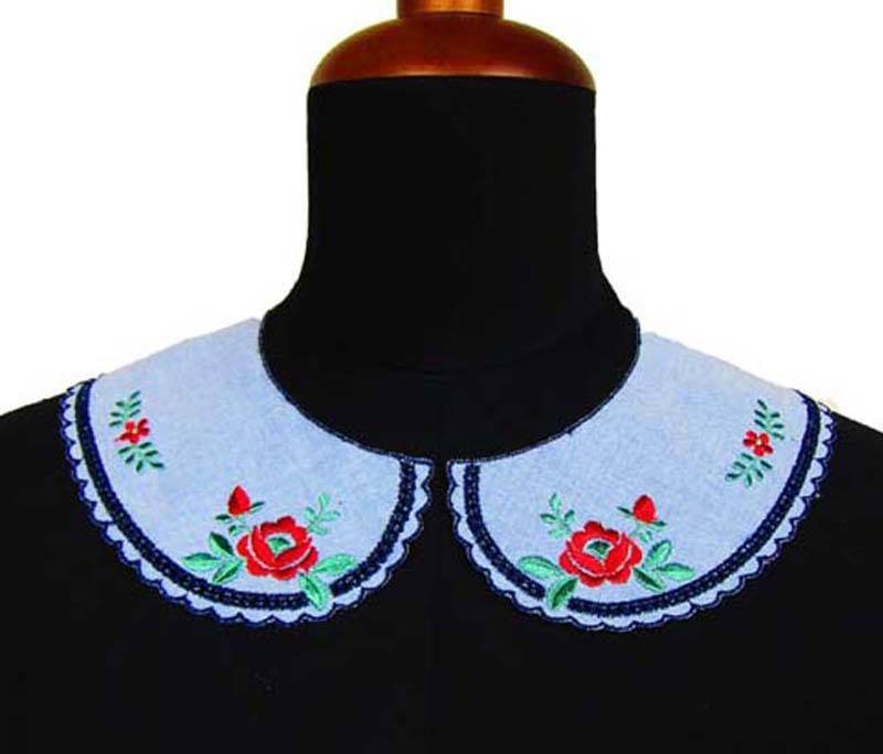 - Kołnierzyk dziecięcy z błękitnej bawełny z wyhaftowanymi czerwonymi różyczkami.