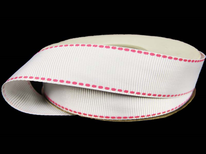 Wstążka rypsowa o szerokości 20mm w kolorze białym z nadrukowaną stebnówką w kolorze czerwonym.