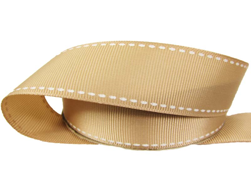 Wstążka rypsowa o szerokości 25mm w kolorze beżowym z nadrukowaną stebnówką w kolorze białym.