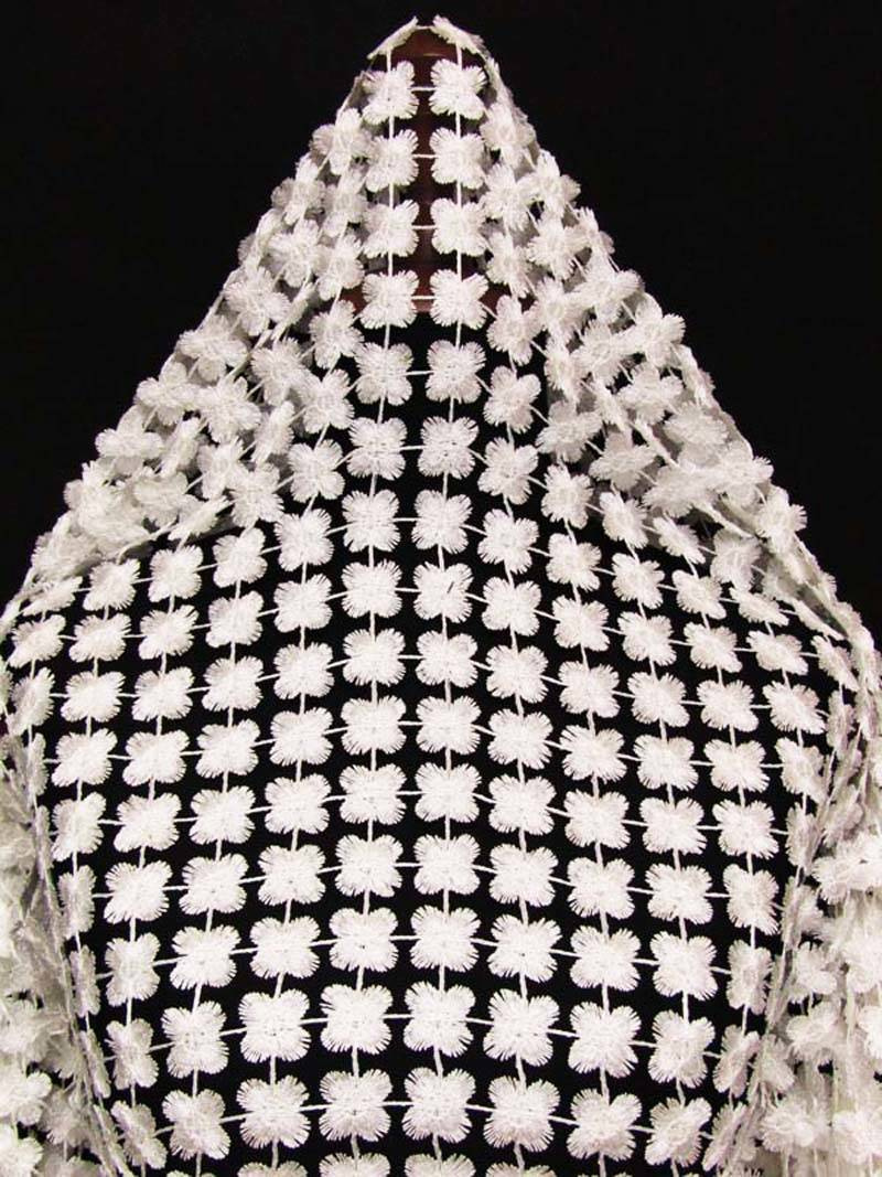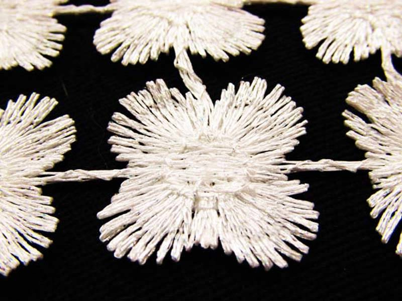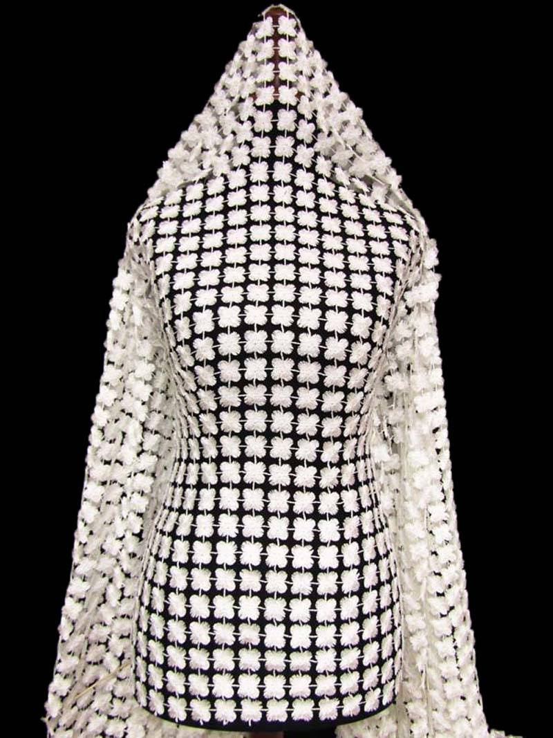 Tkanina złożona z siatki drobnych kwiatów przeplecionych błyszczącą nitką. Całość wzoru połączona cienkimi niteczkami.