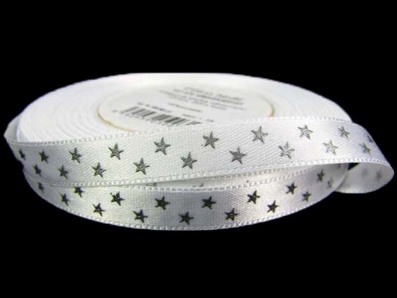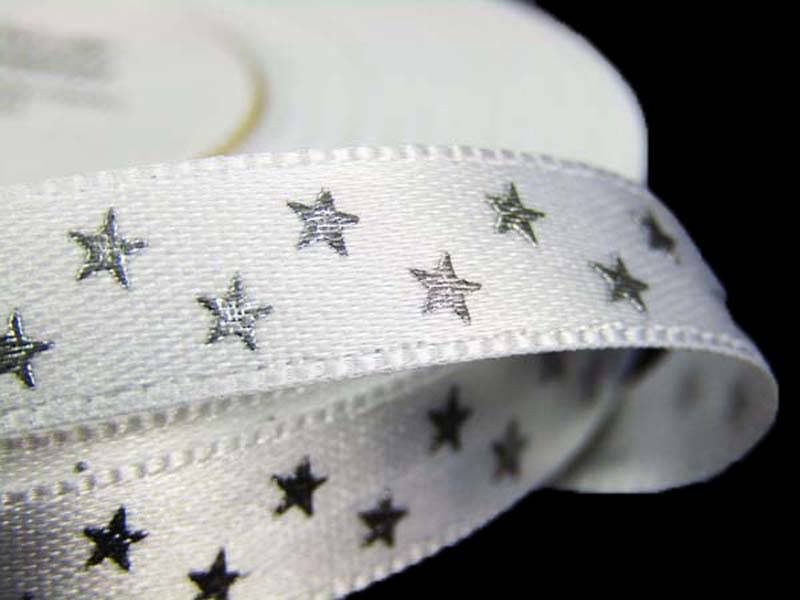 Wstążka z atłasu o szerokości 1cm ze srebrnym nadrukiem w kolorze.