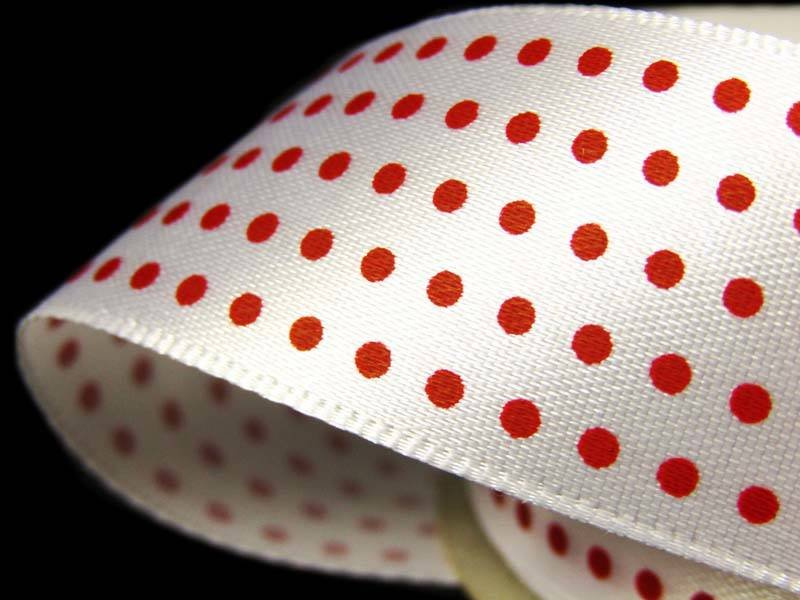 • Wstążka atłasowa o szerokości 2,5cm z jednostronnym nadrukiem kropek na kolorowym tle.