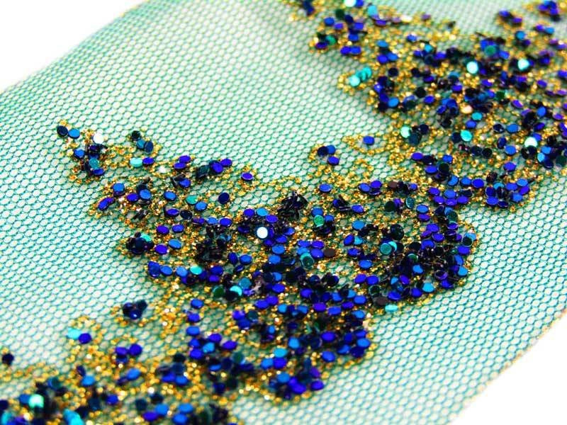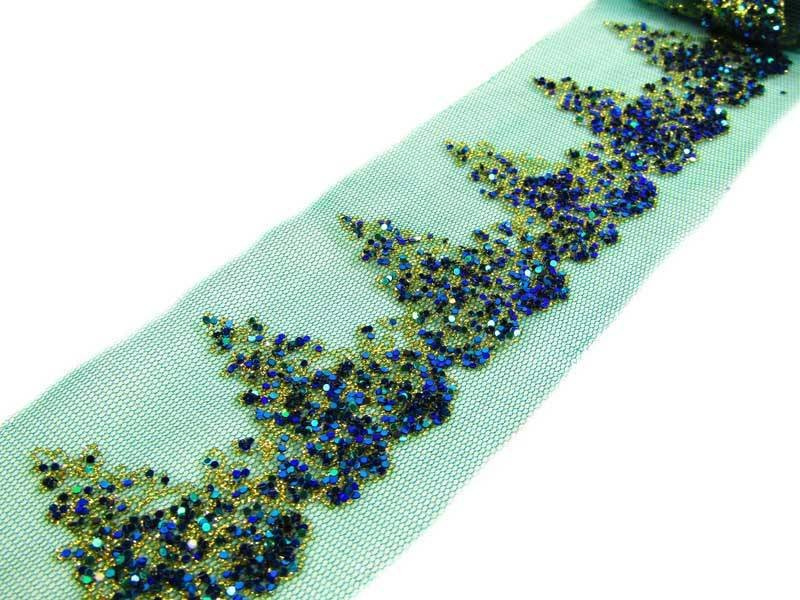 - Ozdobna taśma tiulowa o szerokości 6,5cm w kolorze zielonym posypana brokatem złoto-granatowo-zielonym.