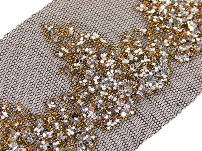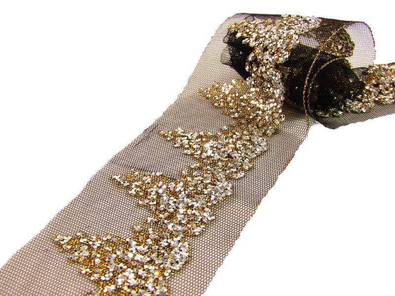 Ozdobna taśma tiulowa o szerokości 6,5cm w kolorze czarnym posypana brokatem złoto-czarno-srebrnym.