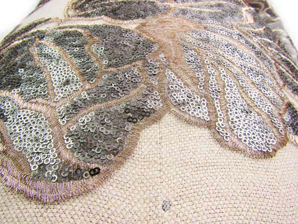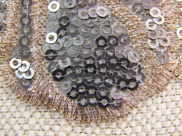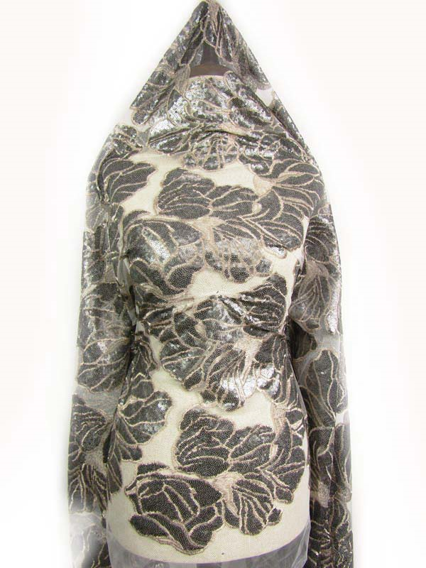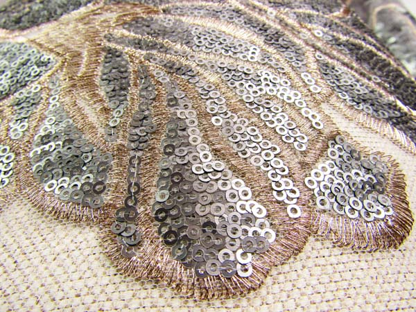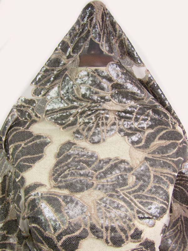Tkanina haftowana drobnymi cekinami i dodatkowo obszyta metaliczną nitką. Haft ma charakter roślinny. Brzegi nadają się do wycięcia.