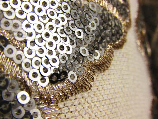 - Tkanina haftowana drobnymi cekinami i dodatkowo obszyta metaliczną nitką.