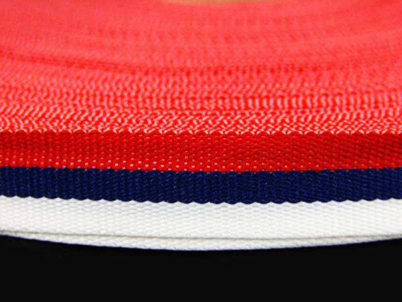 - Taśma o szerokości 1,1cm tkana obustronnie w pasy czerwono_granatowo_białe.